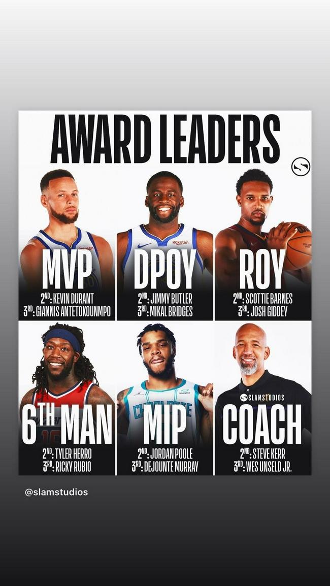 最佳防守球员是追梦(第二名巴特勒,第三名米卡尔-布里奇斯);