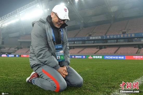 成功保级后,重庆队主教练张外龙跪地痛哭。图片来源:IC photo